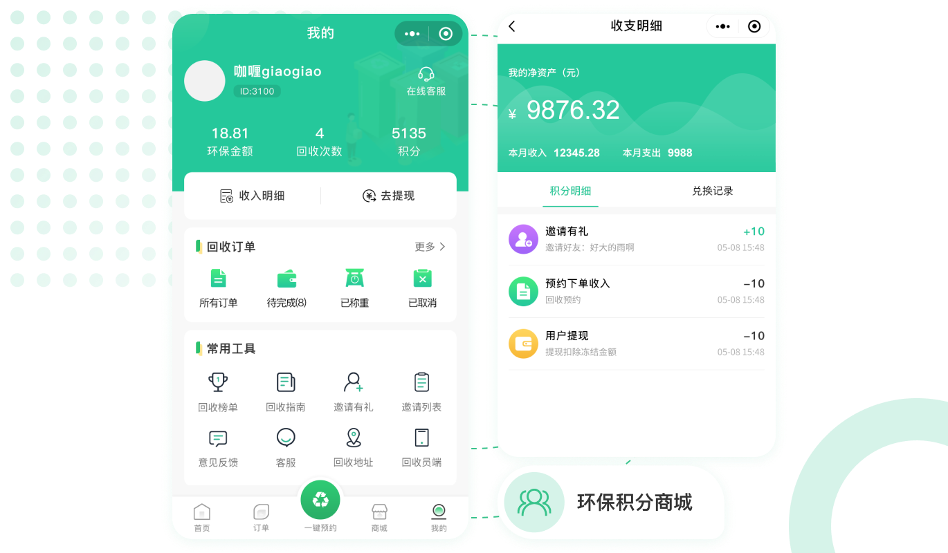 用戶出售垃圾廢品換錢的同時(shí)享受積分,積分可以兌換商品,增加用戶的使用黏性。